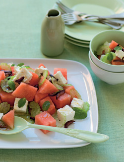 Verwijder de schil van de watermeloen en snijd het vruchtvlees in hapklare stukken. Snijd de feta in blokjes van ca. 2 cm. Hussel beide voorzichtig door elkaar in een schaal en bestrooi met olijven, munt en selderij. Mix de azijn en olijfolie in een kommetje en sprenkel over de salade. Kruid licht met vers gemaalde zwarte peper.