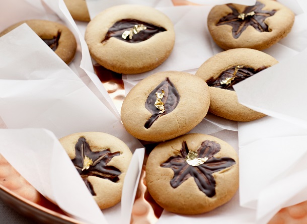 - Laat volledig afkoelen en breng met een ander kwastje op de helft van de blaadjes wat bladgoud aan.