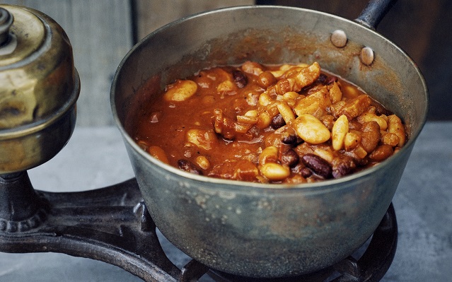 - Voeg de mosterd, tomatenpuree, Worcestershire sauce, 1 eetlepel ahornsiroop, bouillon, passata, bonen, zout en peper toe en roer goed door.