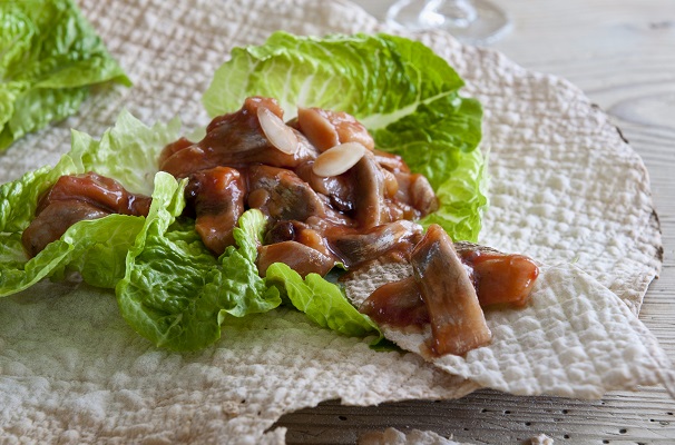 - Laat 10 minuten zachtjes sudderen onder af en toe roeren. Laat de saus afkoelen en voeg de amandelen en de rozijnen toe.