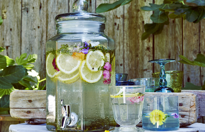 - Snijd de citroenen in plakjes en doe samen met de rest van de kruiden en de bloemen in een limonadedispenser of een karaf.