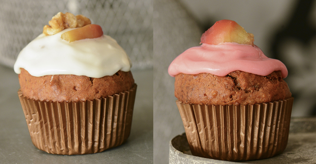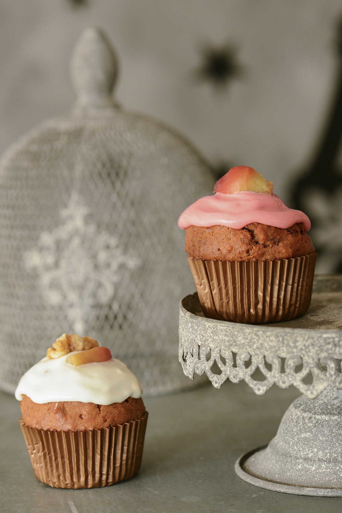 10. Bestrijk de afgekoelde muffins met het glazuur en versier met een halve walnoot en/of een andere versiering.