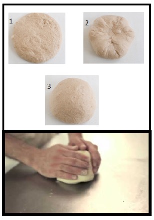 6. Vorm het deegmengsel in 2 gelijke delen, maak hier een plat rond deeg van ongeveer 3 cm dik van en vouw het naar binnen tot een kleinere cirkel. Draai het deeg om zodat de gevouwen kant onderop ligt en maak met het deeg draaiende bewegingen tot het een bol vormt, van ongeveer 5 cm dik. Laat dit ongeveer 1 uur rijzen. Zie onderstaande foto voor uitleg.