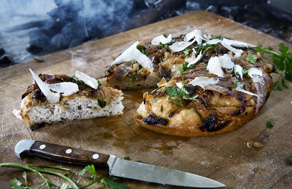 10. Eenmaal uit de oven beleg je het brood met de ansjovisfilet, parmezaanse kaas en gehakte peterselie.