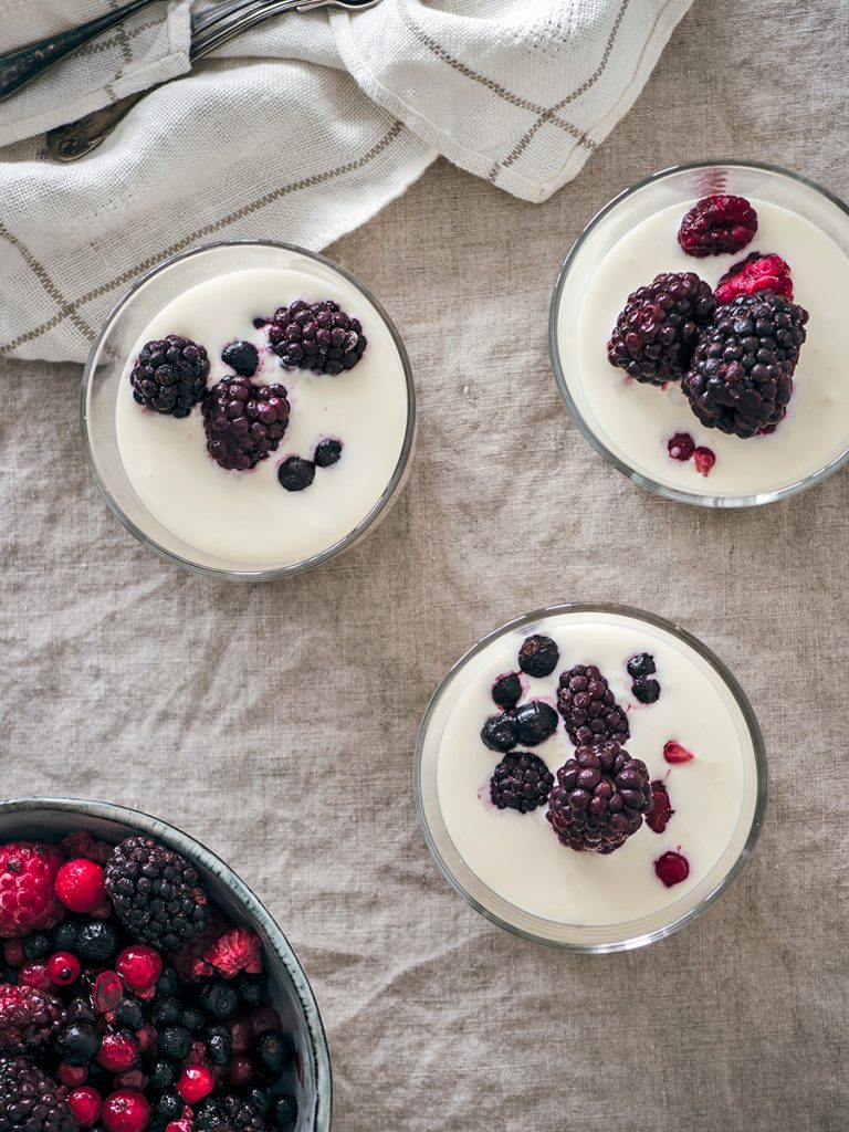 • Laat in 5-6 uur (of een nacht) opstijven in de koelkast en verdeel vlak voor het serveren de bramen erover.