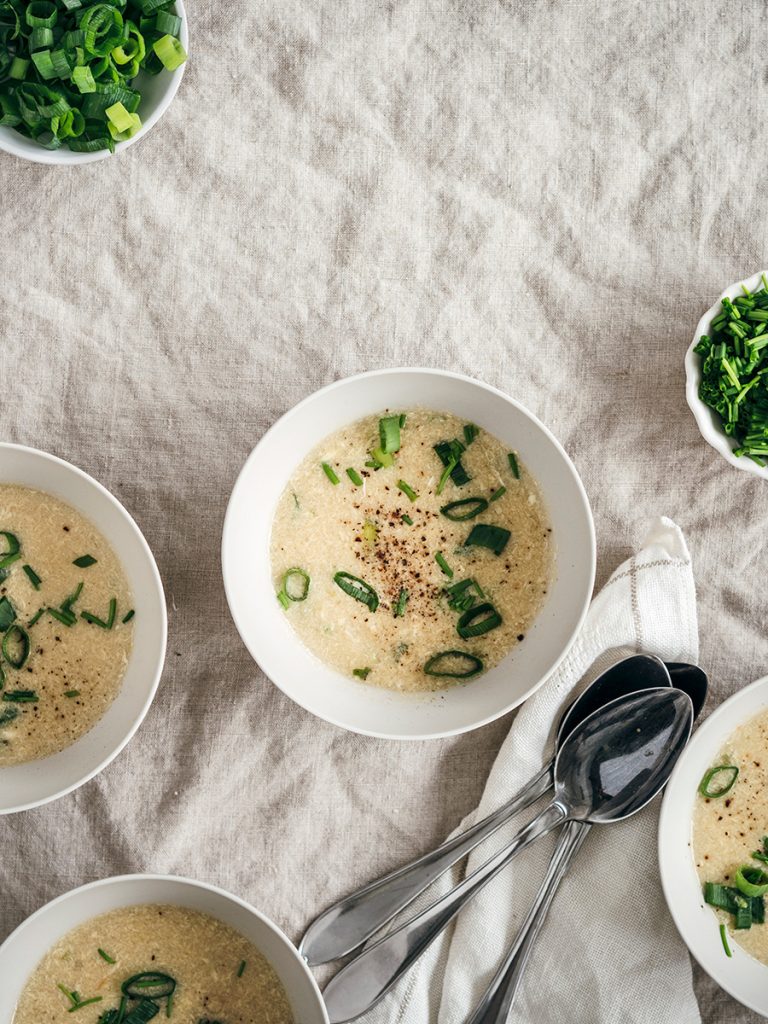 • Voeg al roerend het maïzenamengsel toe aan de soep. Voeg de helft van de bosui toe.