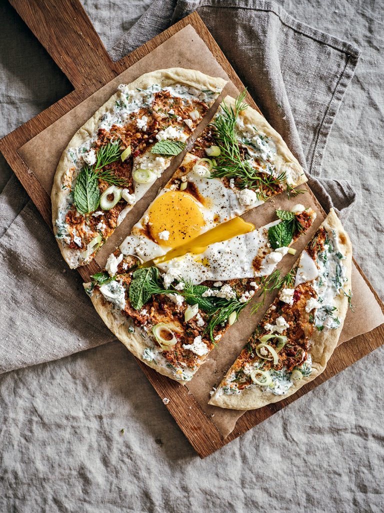 • Verdeel de yoghurtsaus over de naans. Verdeel 1-2 el pesto over de yoghurt en roer tot er een mooi marmereffect ont-staat. Leg een ei op elke naan, bedruppel met pittige botersaus en bestrooi met zout en versgemalen peper.
