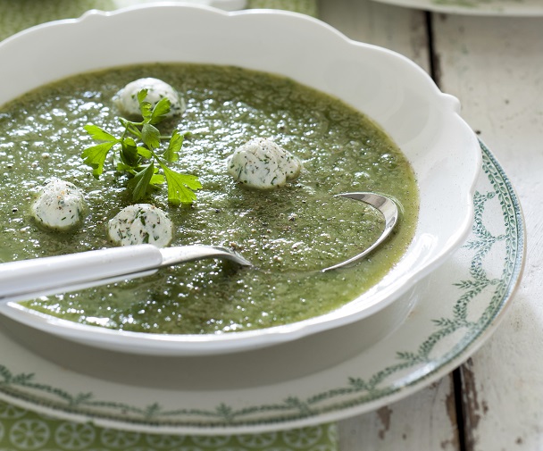 11. Schep de koude soep in 4 soepborden en verdeel er de kaasballetjes over. Schenk er nog wat drupjes olijfolie op. Serveer met de croutons.