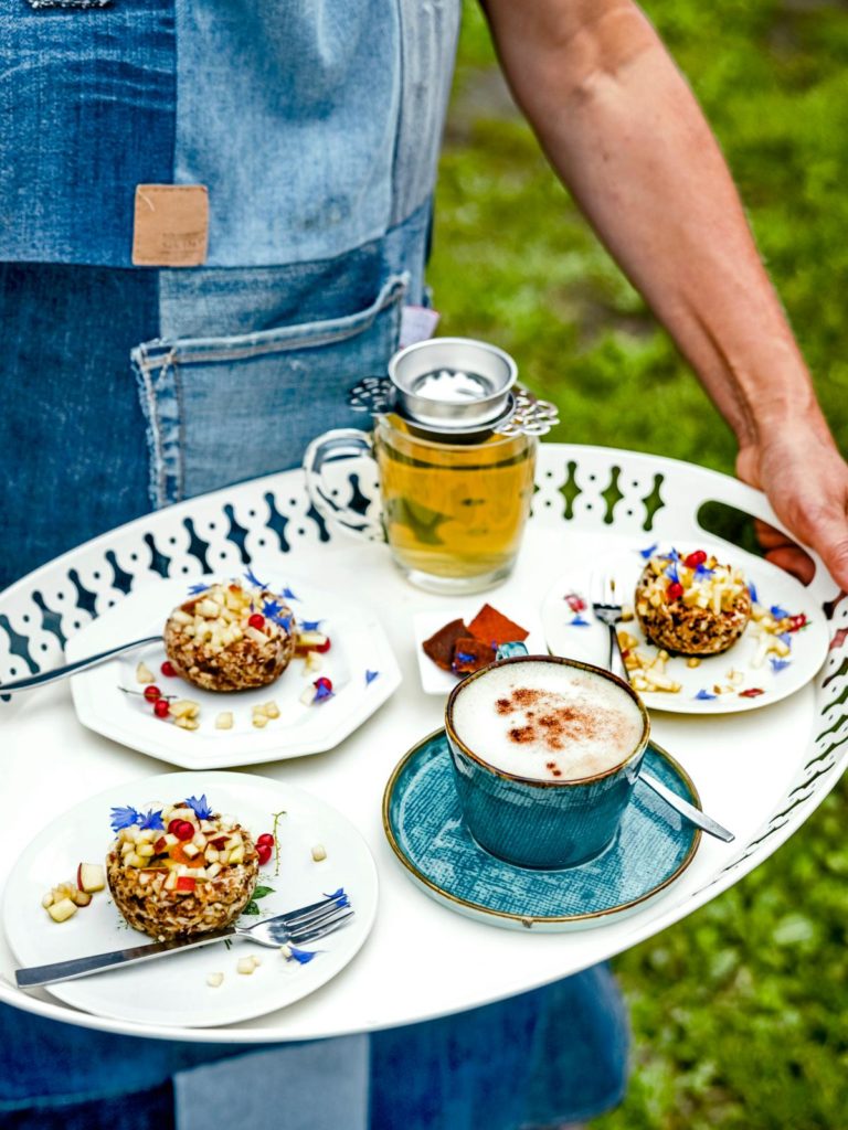 Een tijdje terug ging een ‘stel topkoks nog uit hun dak’. Samen met Laurette van Slobbe zochten ze naar wilde planten uit de streek om in hun gerechten te verwerken. Ze waren aangenaam verrast door het kruidige karakter van hondsdraf en de aangename, champignonachtige smaak van bosandoorn. “Geweldig dat ik mensen op nieuwe ideeën mag brengen”, lacht Laurette, terwijl ze een schaaltje zelfgemaakte havermoutkoekjes met engelwortel en dadels met lariks en bloemetjes op tafel zet. De voorliefde voor bloemen, planten en kruiden is een levenslange passie, zegt ze. “Op de basisschool was ik al in de weer met een plantenpers. Ik plakte gedroogde bladeren in een schriftje en schreef de Latijnse namen eronder.”