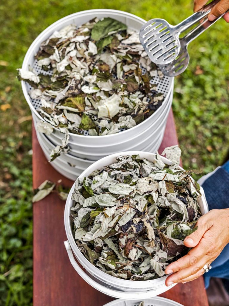 Ze volgde in grote lijnen het maakproces van een gefermenteerde thee met bladeren van de Camellia sinensis, maar dan dus met blaadjes van de braam, zoals dat ook vroeger wel werd gedaan. Laurette gebruikt jonge scheuten van een bramenstruik en laat deze kort verwelken. “Daarna kneus ik ze om de sappen, en dus de smaken, los te laten. Ik maak ze vochtig en wikkel ze vervolgens strak in een schone doek. Bij de juiste temperatuur gaan bacteriën hun werk doen. Net als bij het productieproces van wijn en kaas geeft de fermentatie diepere smaken.”
