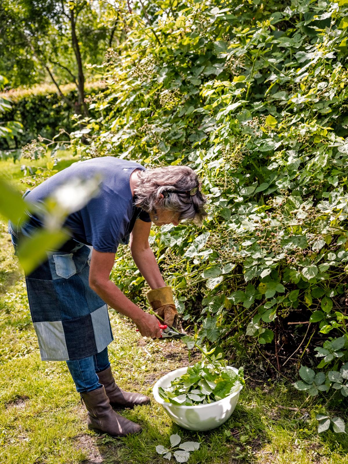 De smaaknuances kunnen overigens per oogst verschillen. “Ik heb mijn procedé niet gestandaardiseerd. Per keer kan het een tikkeltje anders zijn.” Momenteel verwerkt Laurette zo’n dertig kilo per oogstseizoen. Ze wil graag opschalen, zegt ze. “De bottleneck is vooralsnog de droogcapaciteit. Binnenkort gaan we een droogkast maken.” Ondertussen experimenteert ze vrolijk verder met wilde thee. Op de menukaart van haar theetuin vind je naast de bekende kamille-, munt- en vlierbloesemthee, allemaal uit eigen tuin, inmiddels ook een geurige braambladvariant met roos, akkerdistelwortel en munt. “Hij is best zoet. Dankzij de roos en de munt komt er iets van honing en lavendel naar voren. De akkerdistel is heel dienend, geeft hem iets aards. Mooi in harmonie, maar ook behoorlijk krachtig. Echt een thee voor de middag.”