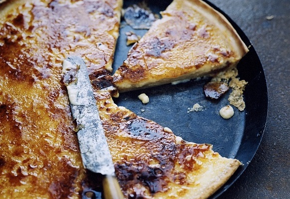 Besprenkel net voor het serveren de taart met de suiker en karmeliseer met een crème brûlée-brander.