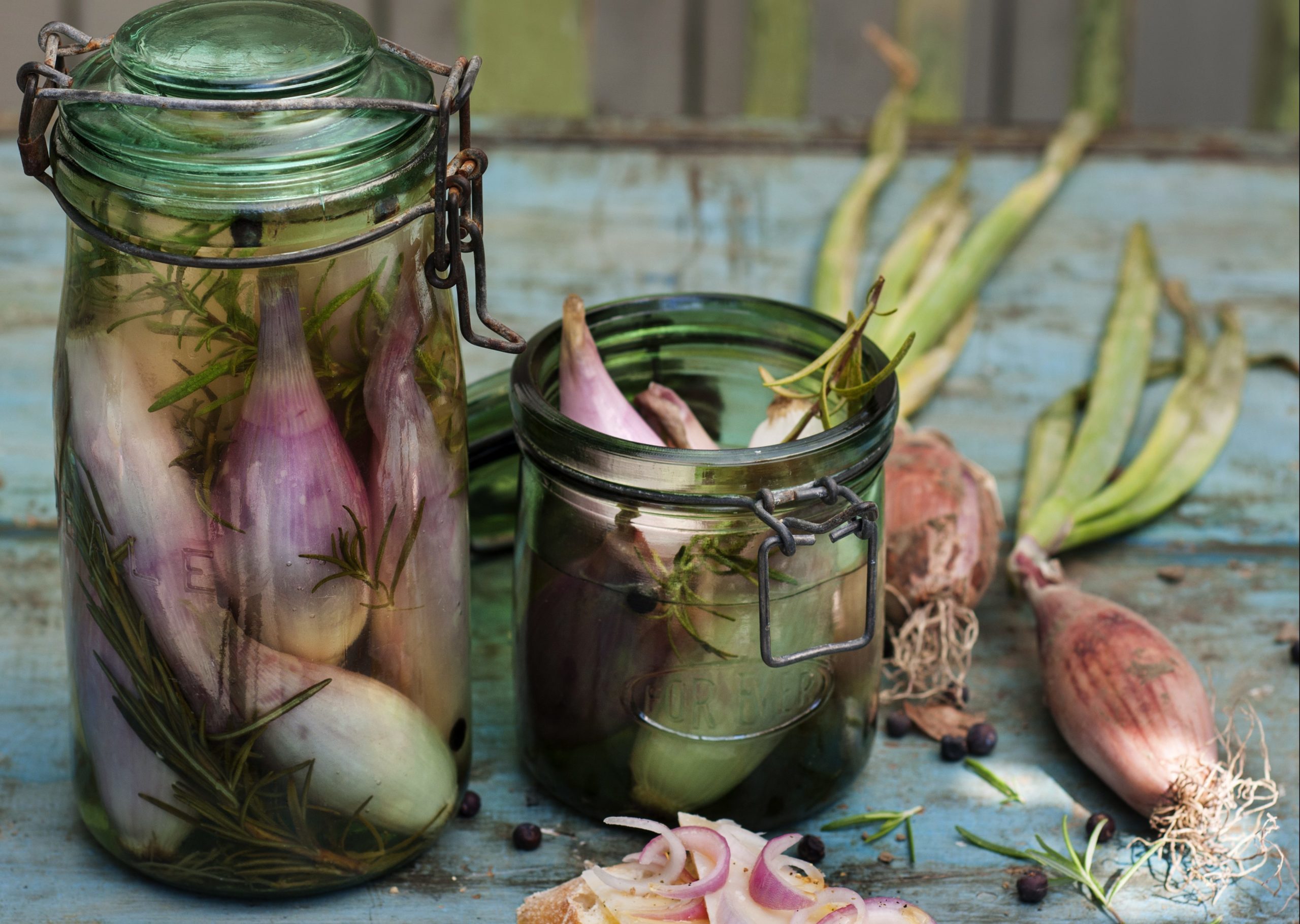 - Doe de sjalotten in twee goed schoongemaakte en gesteriliseerde potten.