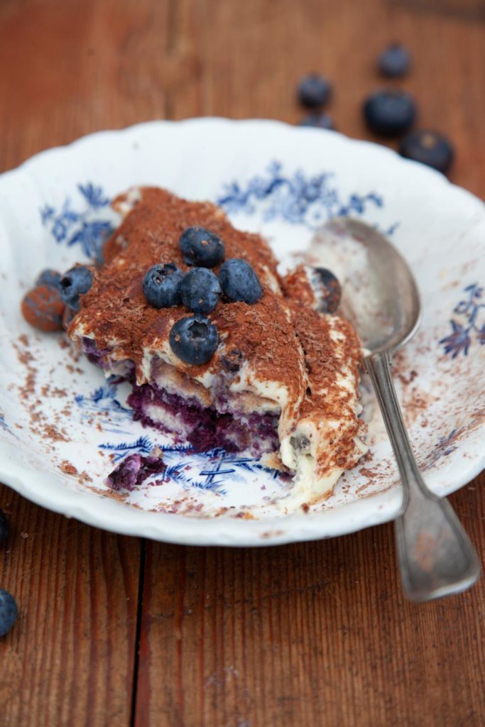 Tiramisu is het hele jaar door om van te smullen, maar deze met zoetfrisse blauwe bessen is leuk om op een zwoele avond op tafel te toveren. Nu ja, toveren, je zult er wel wat voor moeten doen. Oh, en vergeet ‘m niet een uur voordat je hem serveert uit de koelkast te halen, dan is-ie lekkerder. Deze tiramisu is zonder koffie, maar met blauwe-bessensap. Alleen al daarom leuk om eens te proberen.