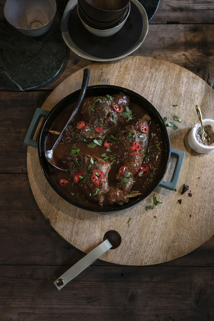 - Breng aan de kook, zet dan het vuur op z’n allerlaagst en laat 2,5-3 uur met het deksel op de pan stoven tot het vlees zacht is en van het bot valt.