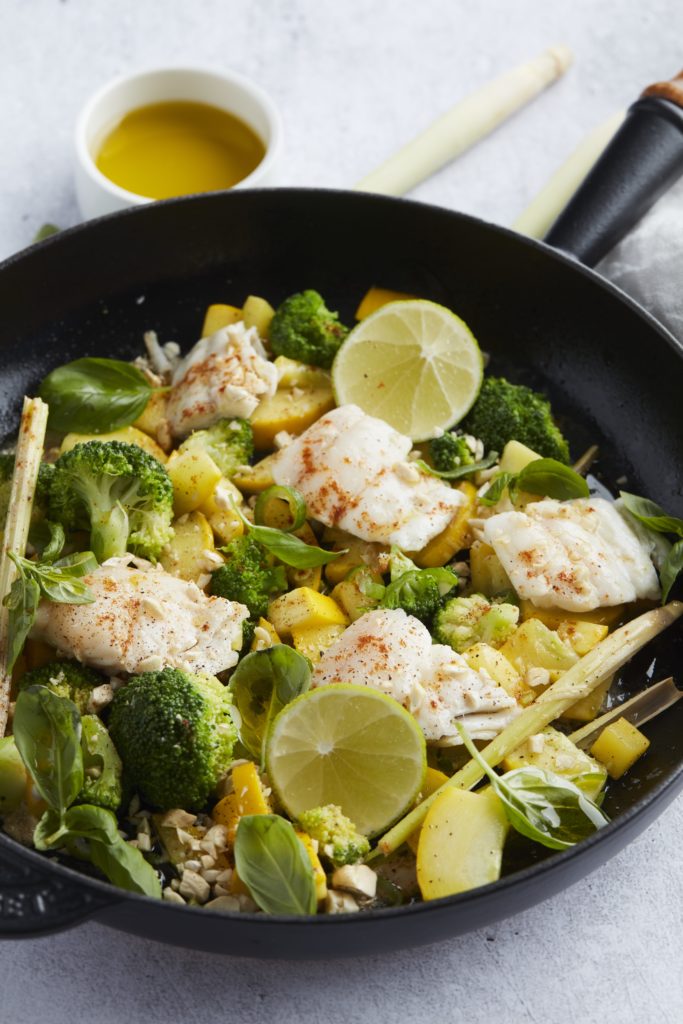 “Ben je ook gek op de Thaise keuken met al zijn pittige smaakmakers? Deze eenpansmaaltijd van groenten en vis met kokosmelk en citroengras is in een tiental minuten al voorbereid en een echte smaakbom. Ideaal als het snel mag gaan!”