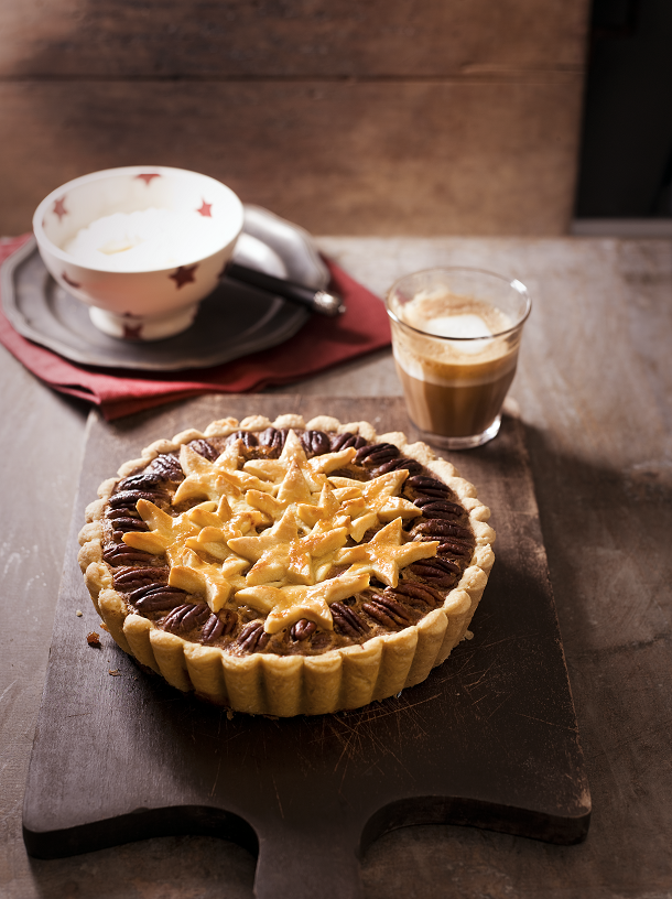 - Houd genoeg mooie pecannoten apart voor een rand bovenop de taart, hak de rest grof en roer door de vulling. Doe de vulling in de vorm en schik de pecannnoten langs de kant. Leg de sterren in het midden.