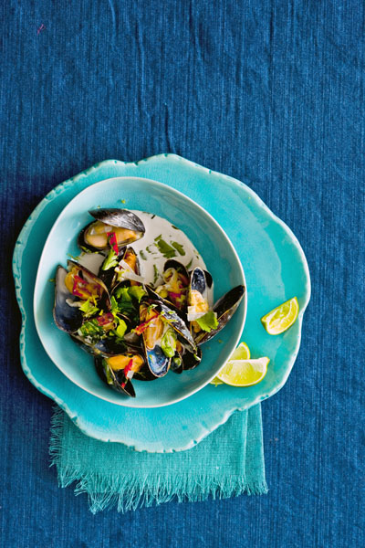 - In deze pittige mosselen met kokosmelk zijn invloeden uit Thailand en Vietnam te proeven. Vissaus, citroengras, basilicum en koriander geven de mosselen een lekkere dosis pit. Met kokosmelk als milde basis.