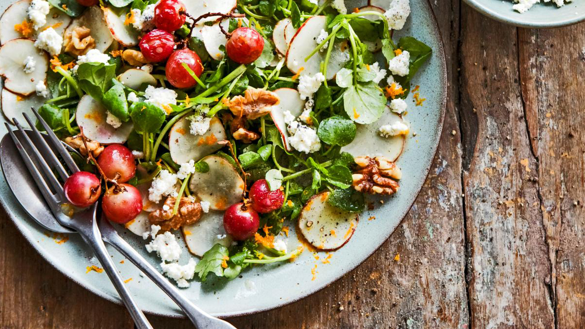 - Maak de salade af met de druiven, walnoten en ricotta.