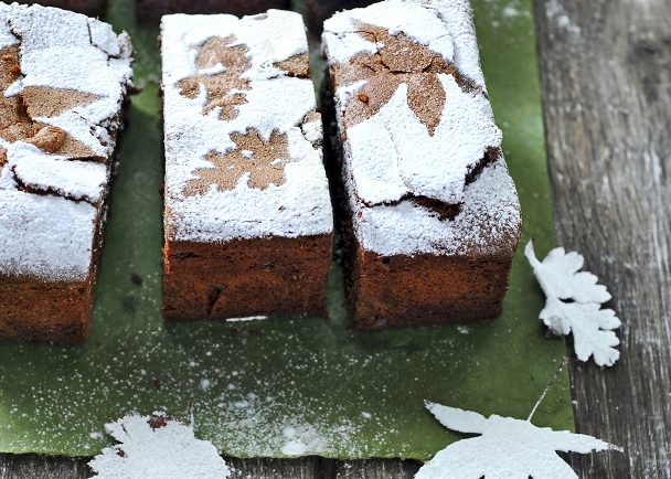 - Doe poedersuiker in een zeefje en bestrooi de brownies met suiker.