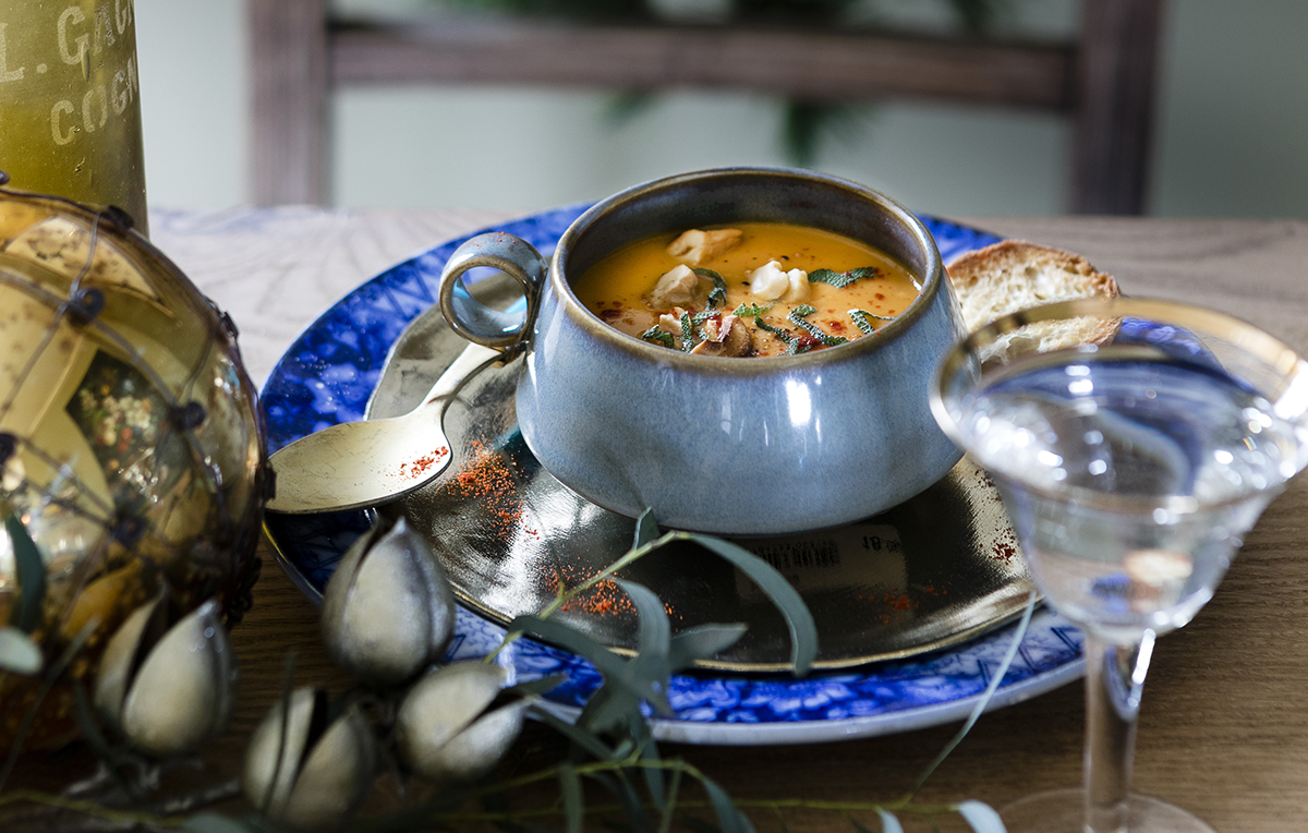 - Verdeel de soep over 4 borden en garneer met de cashewnoten, een beetje gerookte paprikapoeder en de salie. Lekker met geroosterde ciabatta.