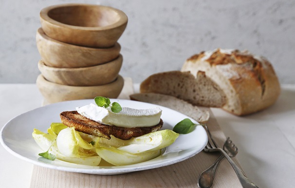 - Leg een stukje geitenkaas op een plakje brood en leg dit op de salade.