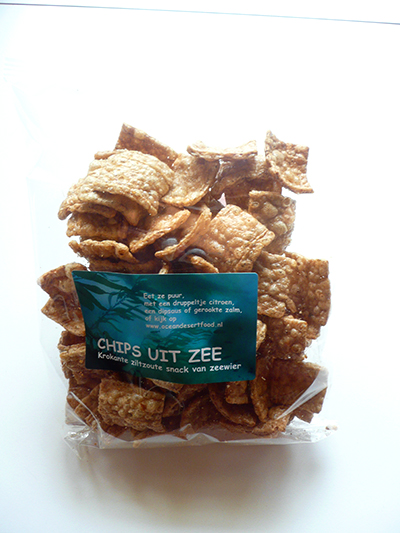 Deze zilte chips bestaan voornamelijk uit kelp, een soort zeewier vol mineralen, vitaminen, jodium en spoorelementen. De gezonde snack wordt knapperig gebakken in zonnebloemolie en kan puur natuur worden gegeten of met een dip van guacamole, humus of salsa. Waar: algopluszeewier Prijs: € 2,75 per zakje van 75 gram.