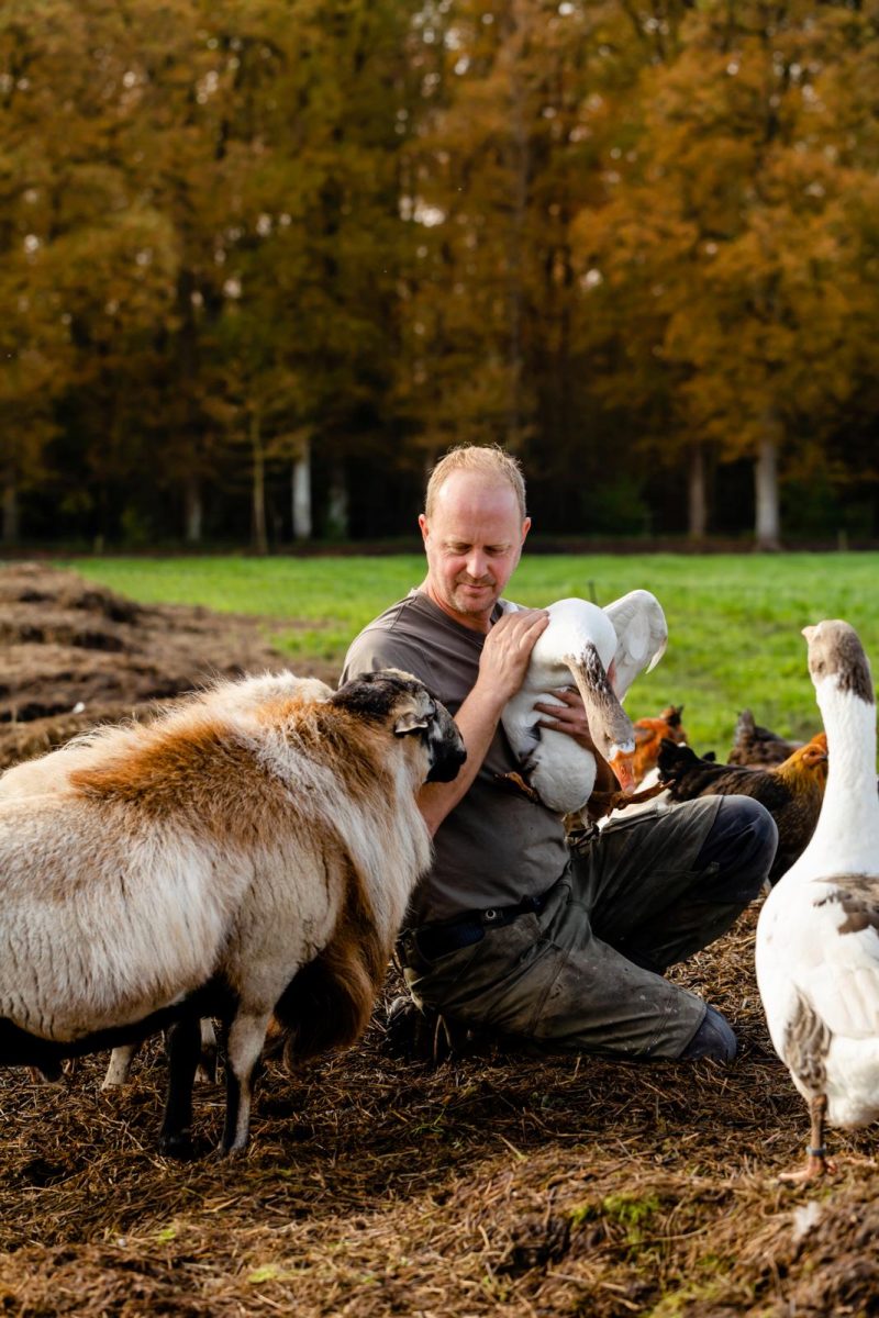 Hoe is het om met zo veel dieren te leven? Richard: “Geweldig! Ik ben altijd gek geweest op dieren. Maar als ik om me heen keek, zag ik dat ze nog maar weinig met natuur te maken hadden. Daar wilde ik wat aan doen. Hier houden we onze dieren op een meer natuurlijke manier. Zo staan ze 365 dagen per jaar buiten en gaan ze geregeld naar een nieuw stuk gras of bos. De dieren mogen in hun eigen tempo groeien en ze verzamelen hun eigen voeding in de natuur. Onze dieren leven ook met hun soortgenoten, zoals in een natuurlijke kudde. En ze kunnen hun natuurlijke gedrag uiten bij ons, doordat ze mogen wroeten, grazen, rondtrekken en scharrelen.” Mariska: “We hebben elkaar zelfs gevonden door onze gedeelde liefde voor dieren. Ik stond op het punt om naar Zweden te emigreren om een eigen boerderij te beginnen. Richard was toen net gestart en ik moest hem interviewen over zijn varkens. Ik vond niet alleen zijn ideeën over natuurvriendelijk boeren heel leuk, maar ook Richard. We hebben onze plannen toen samen verder ontwikkeld. Ik zou dit leven niet meer kunnen missen. Voorheen werkte ik fulltime als projectmanager en zat ik hele dagen binnen. Nu sta ik elke dag in het bos tussen de koeien en varkens.” Zijn er lievelingen? Mariska: “Alle dieren hebben hun eigen leuke dingen. De koeien en schapen kunnen heerlijk genieten van een nieuw stuk grasland. De Tamworth varkens zijn enorm eigenwijs, maar gaan liggen voor een kriebel op hun buik. De dieren krijgen hier eigenlijk geen naam, maar er zijn wel uitzonderingen. Zo heet een van onze koeien El Torro. Dat is zó’n karakteristiek dier, met prachtige gekrulde horens en mooie, lichte ogen. Ze is ook nog eens moeder-overste van de kudde en straalt rust uit. Zij is wel mijn favoriet.” Trekken de dieren naar jullie toe? Richard: “De varkens komen altijd naar ons toe. En niet alleen omdat we eten bij ons hebben, ze zijn gewoon heel sociaal. Vaak rennen ze een heel stuk mee met de kar als we door het bos rijden. Zo’n mooi gezicht! Ook is er een ram die altijd even contact maakt zodra ik de wei inloop. Dan duwt hij zijn kop tegen mij aan. Tussen de ganzen zit ook een knuffelaar. Die legt zijn hals op mijn schouder als hij even aandacht wil.”
