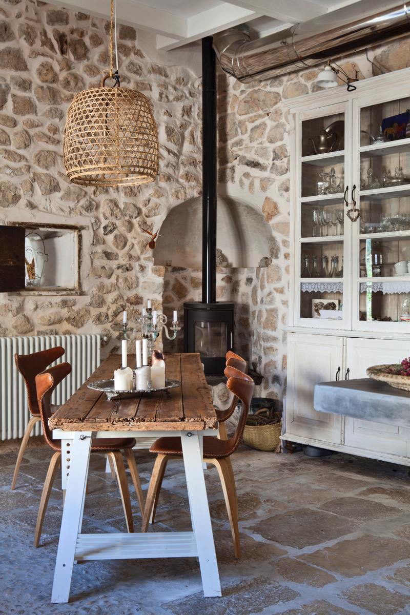Positief ingesteld en niet bang voor een uitdaging overwonnen ze elke moeilijkheid, met om te beginnen het dak. Het werd compleet vernieuwd, inclusief isolatie, en weer bedekt met de oranje, gebakken pannen die typerend zijn voor de regio. De vloer werd opnieuw gelegd in Mallorcaans ruitpatroon van grijswitte kiezels geval in beton. Achter de afbrokkelende kalklaag van de buitenmuren bleken zich eeuwenoude gemetselde stenen te verschuilen. Ze kozen ervoor om die overal weer zichtbaar te maken. Deels afgewisseld met fris wit stucwerk. Jacqueline: “Ik wilde het licht houden. En zo voelen de kamers nog ruimer aan.”