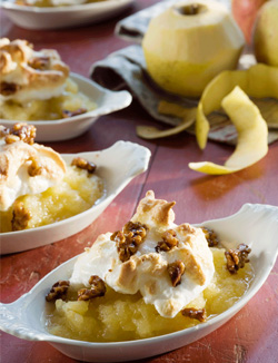 Schil de appels, snijd ze in kwarten en verwijder het klokhuis. Schil de gember en snijd het stukje in vieren. Doe de appels met de gember, de wijn en de citroenschil in een pan en kook de appels in circa 20 minuten zachtjes gaar. Verwarm de oven voor op 200˚ C. Giet eventueel overtollig water af, verwijder de gember en de citroenschil en stamp de appelmoes samen met 150 gram suiker grof. Klop het eiwit stijf met de rest van de suiker. Vermeng de walnoten met de bruine suiker, het piment en het gemberpoeder. Vet een ovenschaal (of kleine ovenschaaltjes) in met 10 gram boter. Verdeel de appelmoes over de bodem en schep er het eiwitschuim over. Bestrooi met het notenmengsel en kleine vlokjes boter Bak nog circa 20 minuten in het midden van de oven. Lekker met een bolletje vanille-ijs.