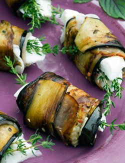 Snijd de aubergines in lange, 1 cm dikke plakken. Bestrooien met zout, na 15 minuten afspoelen en droogdeppen. Bak dan de plakken goudbruin in olijfolie en leg ze naast elkaar op een snijplank. Laat ze afkoelen. Leg dan op iedere plak een plakje prosciutto, een reepje mozzarella (aan het begin) en een takje tijm. Rol het geheel op tot een pakje en bestrooi met wat peper uit de molen.