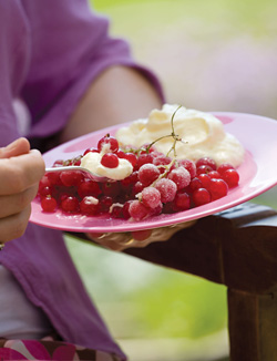 Klop de eiwitten licht op. Bestrijk de trosjes bessen met behulp van een deegkwastje met eiwit. Wentel ze door de fijne kristalsuiker, zodat het lijkt of ze met een laagje rijp zijn bedekt. Laat ze opdrogen op keukenpapier. Klop voor de crème Chantilly de slagroom met de suiker en vanille-essence tot zachte pieken. Klop het eiwit tot het net zijn vorm behoudt en vouw het voorzichtig door de room, doe dit vlak voor je het dessert gaat serveren, anders zakt de room in. Schik op elk bord 5 tot 6 trosjes bessen en schep er wat crème Chantilly naast. Let op: dit recept bevat rauw eiwit.