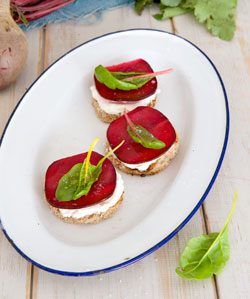 1 Steek met een kookring, koeksteker of glas 12 kleine rondjes uit het brood. Besprenkel het brood met olijfolie en rooster het in een droge koekenpan goudbruin en krokant. 2 Boen het zomerbietje onder stromend koud water goed schoon. Snijd of schaaf het bietje in knapperige dunne plakjes. 3 Besmeer de crostini met de geitenkaas, leg er de plakjes biet en vervolgens de snijbiet op. Bestrooi met fleur de sel en druppel er nog een beetje heidehoning over.
