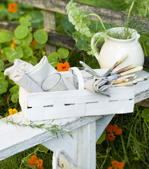 Werkwijze: Spuit de aardbeientips met witte grondverf net niet dekkend wit. Plaats aan één kant de servetten en aan de andere kant het benodigde bestek voor de BBQ. (www.debruinaardbeien.nl)