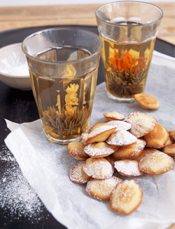 Zet de jasmijnthee met Jasmijn blooming tea volgens de gebruiksaanwijzingen op de verpak-king. Serveer er de luchtige jasmijnthee madeleines bij.