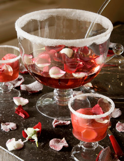 Bestrijk de helft van de rozenblaadjes met behulp van een penseel aan beide kanten met eiwit en wentel ze door de suiker. Laat de blaadjes op een met keukenpapier bedekt bord even opdrogen en herhaal het proces. Laat de blaadjes in een oven van 35˚ C of in de zon door en door droog worden. Bestrijk de rand van de glazen schaal met eiwit en wentel de rand door de suiker. Vul de schaal met de prosecco en roer er voorzichtig het rozenwater door. Laat wat ongesuikerde rozenblaadjes drijven op de schaal. Schep in zes mooie glazen elk een bolletje ijs en giet er de prosecco op. Garneer met extra rozenblaadjes.