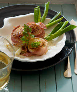Gebakken Sint-Jakobsschelpen met vanillesaus en pancetta
