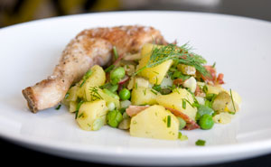 Bereiden Voor de bouten Breng het ganzenvet precies op het kookpunt en confijt de bouten in 2 uur. Pas op dat het niet te hard gaat (af en toe mag er een belletje opkomen). Voor de salade Begin na ongeveer een uur met de voorbereidingen voor de salade. Was de Opperdoezer Rondes en snijd de grotere exemplaren door. Dop en blancheer de erwten en tuinbonen 3-4 minuten. Dubbeldop na afkoeling de tuinbonen. Bak de spekjes krokant en laat ze uitlekken op keukenpapier. Snijd de augurken in blokjes van ongeveer ½ x ½ cm. Was de rucola en sla deze droog (slacentrifuge of met de hand). Start de kooktijd van de Opperdoezer op ca. 35 minuten voor opdienen. Kook ze 20 minuten en giet ze af. Snijd de Opperdoezer in robuuste stukken van ca. 2 x 2 cm en laat 10 minuten afkoelen. Zet de oven op grillstand (300 graden) Voor de afwerking Leg op de borden een bedje van rucola. Haal de bouten voorzichtig uit het vet en leg ze op een vuurvast bord met wat keukenpapier eronder. Zet de bouten 3-4 minuten onder de grill om het vet af te smelten en een begin van een krokant korstje te geven. Meng ondertussen in een grote kom voorzichtig (liefst met 2 handen) de Opperdoezer, erwten, tuinbonen, spekjes, augurken door elkaar. Breng op smaak met royaal olijfolie en wat vers gemalen zwarte peper en (zee)zout. Drapeer de salade op het rucolabedje. Leg de bout naast de salade …. Et voila!
