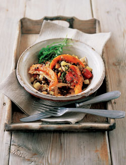 Verrassend lekkere combinatie: het zoet van de pompoen en het frisse van citroen, komen goed tot hun recht met linzen en gebraden kip.