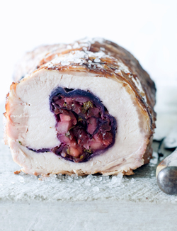 Voor 6-8 personen Traditie: Tijdens het kerstdiner staat er in Scandinavië vaak varkensvlees op tafel. De varkenslende is een veel gegeten luxe stuk varkensvlees. Hier is het gevuld met zuidvruchten en een scheutje aquavit. Het laagje vet bovenop druipt tijdens het bakken in het vlees en zorgt ervoor dat het lekker mals blijft. Ingrediënten: