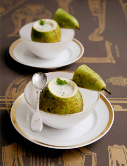 Een soepje met een pittige bite, opgediend in een elegant peertje. Gorgonzola-selderij soep in een peertje Voor 4 personen Voor de bakjes