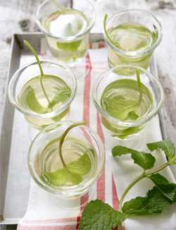 Deze groene thee-muntsiroop is een heerlijke smaakmaker in een fruitsalade met verse abrikozen, perziken en aardbeien. Voeg geen extra suiker toe en garneer met verse muntblaadjes. Of gebruik de siroop als basis voor het maken van abrikozensorbet. Groene thee-muntsiroop Voor 1 fles van circa 1 liter