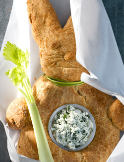In de Marche in Italië wordt met Pasen altijd dit hartige kaasbrood of crescia geserveerd. In deze versie is van het traditionele deeg een haas gevormd met een lekkere dip in zijn buik. Hazenbrood met een dipje Voor het brood
