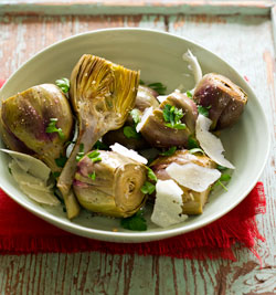 Bereiden Verwijder de buitenste bladeren van de artisjokken en snijd de steel tot 2,5 cm af. Schil de steel. Buig de harde blaadjes naar buiten tot ze breken. Ga hiermee door tot alleen de zachte blaadjes overgebleven zijn. Snijd ongeveer 1/3 van de bovenkant en leg ze meteen in ruim water met het citroensap. Verhit de olie in een koekenpan en bak de knoflook even aan. Leg de artisjokjes in de pan. Voeg 1 deciliter water toe en en breng op smaak met zout en peper. Laat de artisjokken met het deksel op de pan ca. 10 minuten zachtjes koken. Neem het deksel van de pan en laat op iets hoger vuur al het water verdampen. Leg de artisjokken op een bord en besprenkel met wat extra citroensap, olijfolie, (grof) zeezout, de peterselie en de Parmezaanse kaas.