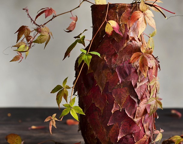 In de herfst zijn er zoveel mooi gekleurde bladeren. Jet werd erdoor geïnspireerd en beplakte deze glazen en aardewerk vazen ermee. De vazen krijgen kleur en struktuur. Ze lijken bijna op leer of textiel. Mooi zonder iets erin of één enkele tak of bloem is genoeg. Zelfmaken Voor deze productie hebben we vazen van glas en aardewerk gebruikt, je kunt je eigen vazen gebruiken of vazen kopen in de winkel of de kringloop. Let vooral op de vorm van de vazen, die is hierbij van groot belang. Niet te lang wachten met het beplakken van de vazen anders drogen de bladeren uit en worden ze te hard om nog te buigen en zullen ze breken. De vazen kun je op verschillende manieren beplakken.
