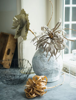 Werkwijze: Vaas: Blaas een ballon op. Knip 2 lange smalle stroken (2,5  cm breed) karton en maak hier 2 ringen van door de uiteinden aan elkaar te plakken/nieten. Maak een schaal met behanglijm aan volgens de gebruiksaanwijzing op de verpakking. Plak de ringen met stroken krantenpapier en behanglijm vast aan de bovenkant en onderkant van de ballon, bij wijze van hals en voet van de vaas. Beplak nu de ballon volledig met stroken krantenpapier. Laat goed drogen en breng een nieuwe laag aan. Herhaal dit ongeveer 4 keer, zodat de wand stevig genoeg is. Goed laten drogen en met een ‘droge kwast’ een licht transparant laagje witte verf aanbrengen, waar de krantenletters nog doorheen schijnen. Bloemen: Knip voor de stelen stukken ijzerdraad van ongeveer  50 cm. Knip uit craftpapier dunne stroken (5 cm breed). Smeer deze in met behanglijm en wikkel deze stroken om het ijzerdraad, totdat de steel helemaal bedekt is. Knip vervolgens een brede baan van 25 cm breed over de volledige breedte van het papier en rol deze baan strak op en plak het uiteinde vast. Knip nu het opgerolde papier vanaf de bovenkant tot op 2 cm in. Het papier zal automatisch omkrullen (bij het craftpapier). Bij dikker papier het papier enigszins omkrullen door met de scherpe kant van een schaar langs de onderkant van de verschillende stroken te  trekken. Schuif de bloemsteel in de onderkant van de bloem en lijm hem vast met een extra strook papier. Maak een klein propje van papier en lijm dit in het hart van de bloem. Pioenroos: Knip de bloemblaadjes uit het lichtgroene ‘Canson’ papier. Knip het hart van de bloem 1 x uit, de kleine bloemblaadjes 4x en de grote 5x. Buig de blaadjes enigszins in vorm. Steek de bloemsteel door het hart van de bloem en lijm hem vast m.b.v. het lijmpistool. Lijm vervolgens de blaadjes onder het hart, laat de zijkanten enigszins overlappen. Krul de blaadjes aan de bovenkant een beetje naar onderen, eventueel m.b.v. de scherpe kant van de schaar. Plak aan de onderkant van de bloem waar hij in de steel overgaat nog een extra strook craftpapier. Takken: Maak nog een paar extra lange takken. Maak ze op dezelfde manier als de bloemstelen, maar dit keer iets langer en krul ze in vorm.