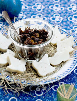 Hak de gember in zo klein mogelijke stukjes. Doe de helft van de rozijnen en alle andere ingrediënten in een keukenmachine en meng ze tot een grove pasta. Voeg de andere helft van de rozijnen toe en meng alles goed door. Snijd uit de plakken kaas kaasmeisjes en klompjes. Kerf met een scherp mesje ogen, een neus en een mond in en serveer met de boerenjongens.
