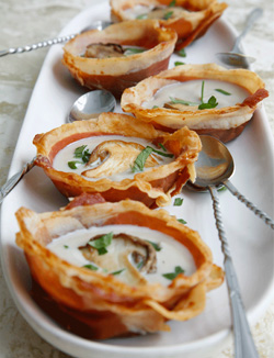 Een dikke, geurige wintersoep in een bakje van parmaham. Kastanje-porcini soep in parmaham-bakjes Voor 4 personen Voor de bakjes:
