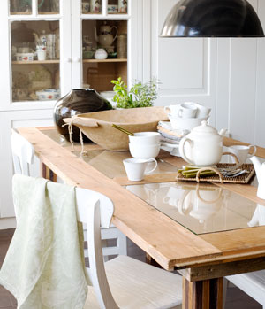 Een kastdeur of paneel heeft vaak een onbewerkte binnenkant. Bij deze tafel wordt juist die binnenkant als buiten/bovenkant gebruikt. Op de verdiepte delen liggen glasplaten. Daardoor ontstaan kleine ‘kijkkastjes’, die u per seizoen of zelfs per maaltijd kunt vullen met bijvoorbeeld bladeren, kruiden of een mooie afbeelding. Ook zonder ‘vulling’ is de tafel mooi om te zien. Werkbeschrijving Zoek een mooi oud paneel uit een kast of een oude paneeldeur. Zoek er een paar mooie passende tafelpoten bij. Meet de panelen in de deur op en laat glasplaatjes op maat maken. Zorg dat de dikte van het glas overeenkomt met de diepte van het paneel. Meet het tafelblad en maak een frame van een mooi hout voor onder de tafel waartussen de tafelpoten worden geschroefd. Leg de glasplaatjes in de panelen, met daaronder eventueel decoratiemateriaal.