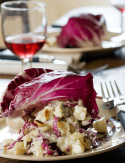 Schil de knolselderij en de aardappelen en snijd ze in blokjes. Kook de knolselderij met de aardappel in een laagje water met zout in circa 15 minuten gaar. Verwijder vervolgens de groene bladeren van de bloemkool en zet de groente op met een laagje water met zout. Stoom de bloemkool in circa 20 minuten gaar. Stamp de knolselderij met de aardappel en de roomkaas tot puree en pureer met een staafmixer de bloemkool. Meng de bloemkool met de knolselderij-aardappelpuree. Verdeel de stamppot over de 4 radiccioblaadjes en strooi er de gorgonzola en de pijnboompitten over.